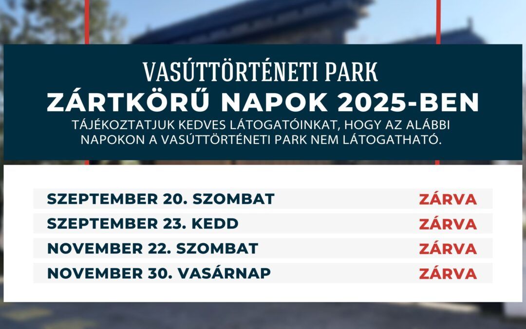 Tájékoztatjuk kedves látogatóinkat, hogy a Vasúttörténeti Park az alábbi dátumokon zártkörű rendezvény miatt nem látogatható.